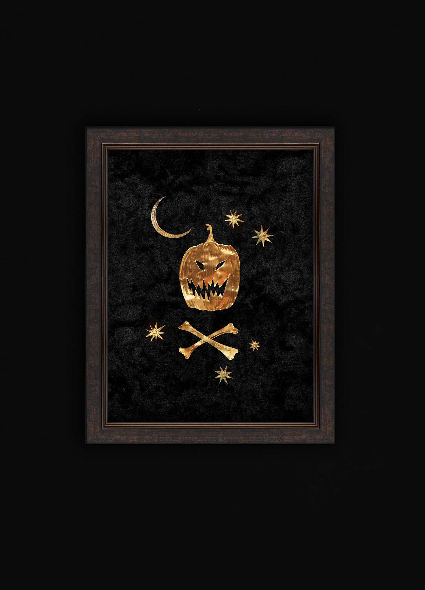 A playful yet haunting ode to the spirit of Halloween, this Legacy Brass Art piece features a hand-cut pumpkin resting above an X of crossed bones.