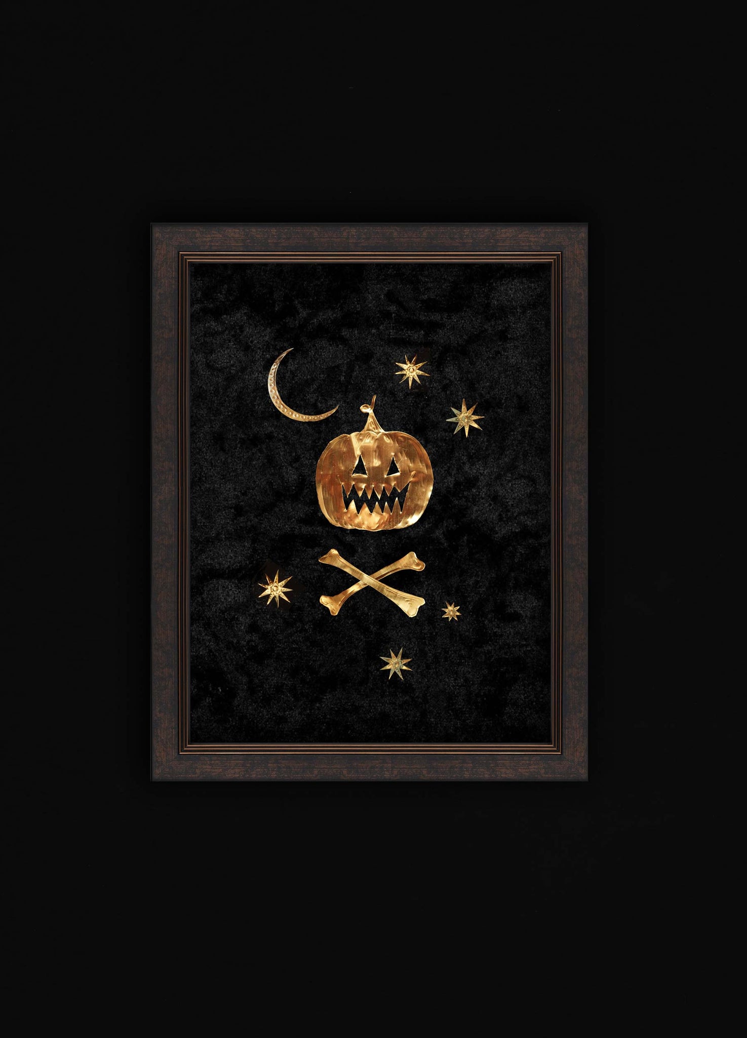 A playful yet haunting ode to the spirit of Halloween, this Legacy Brass Art piece features a hand-cut pumpkin resting above an X of crossed bones.